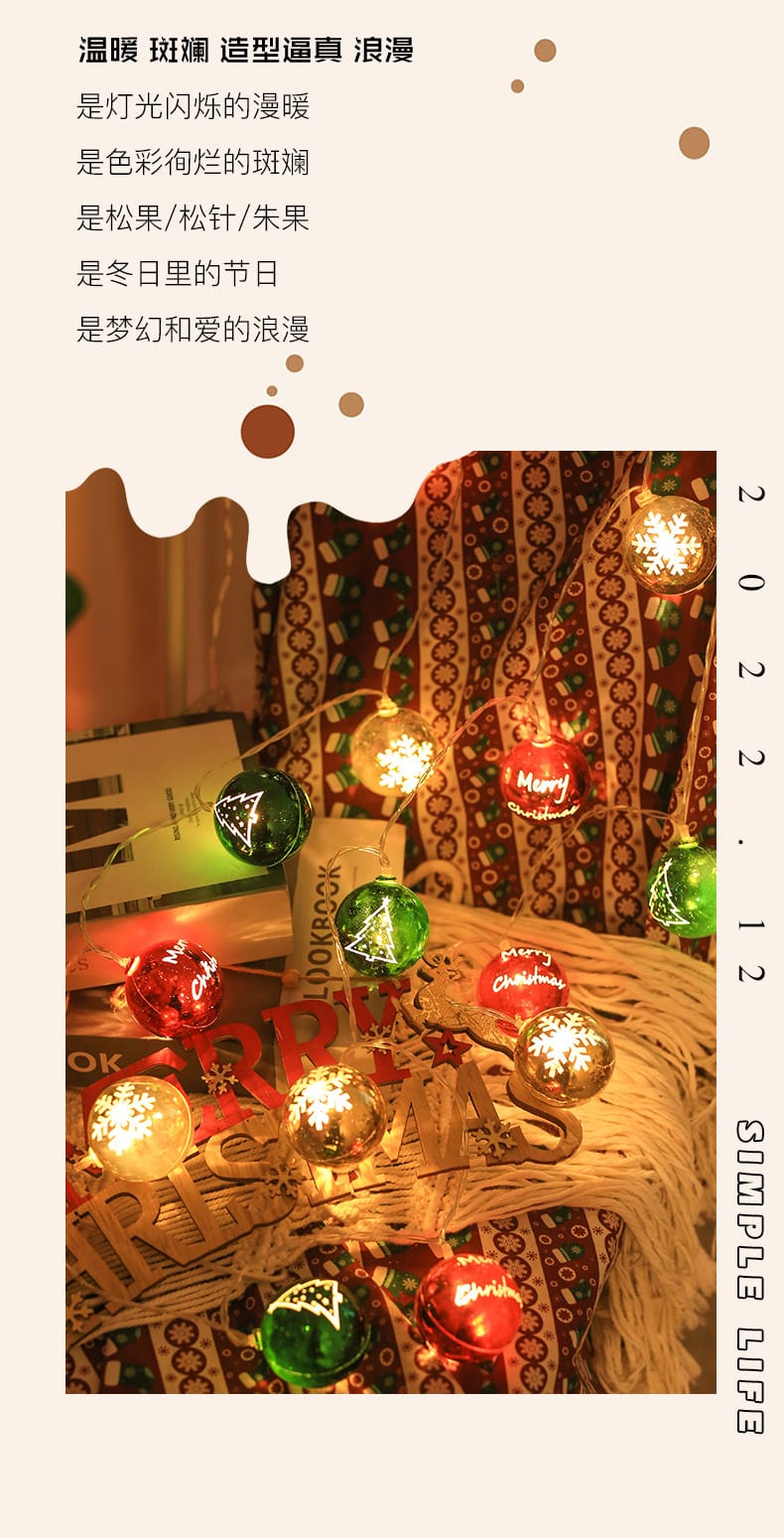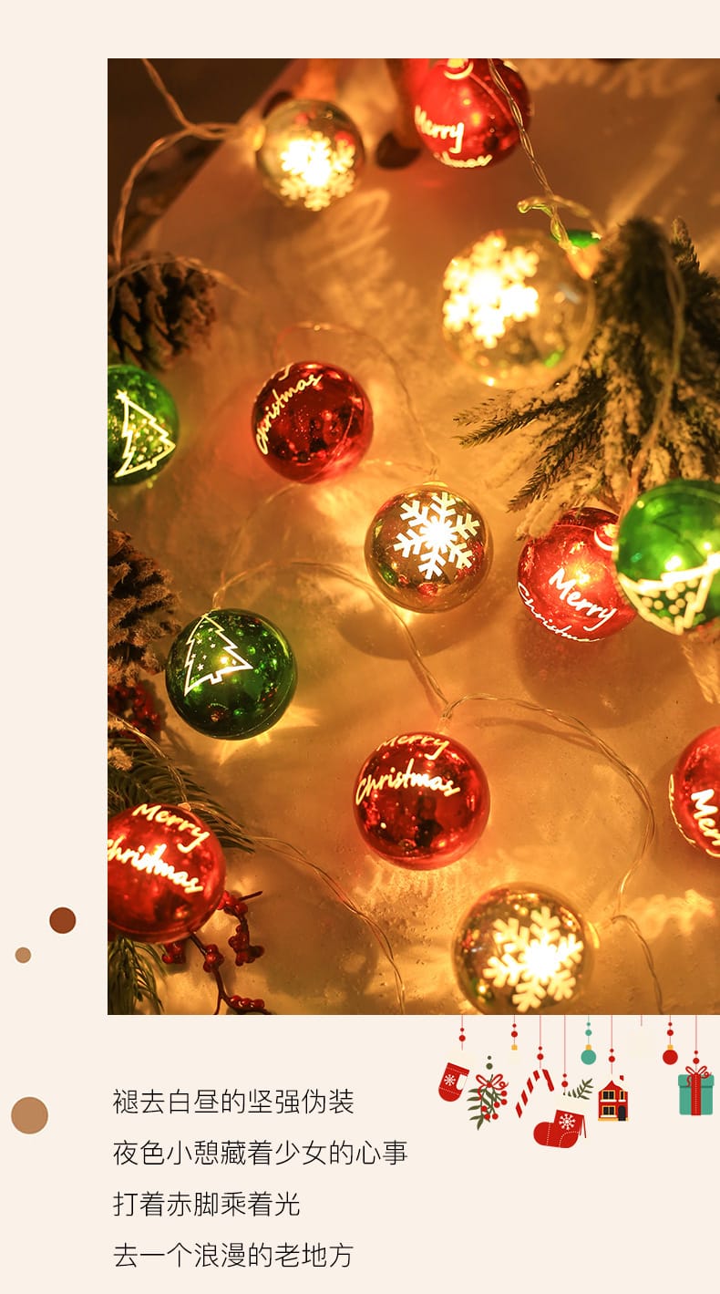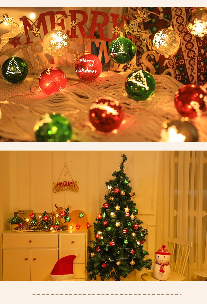 Sus esferas decorativas de colores navideños (rojo, verde y dorado) cuentan con elegantes grabados de copos de nieve, árboles y la frase “Merry Christmas”, iluminados con una luz cálida que crea una atmósfera acogedora y festiva.