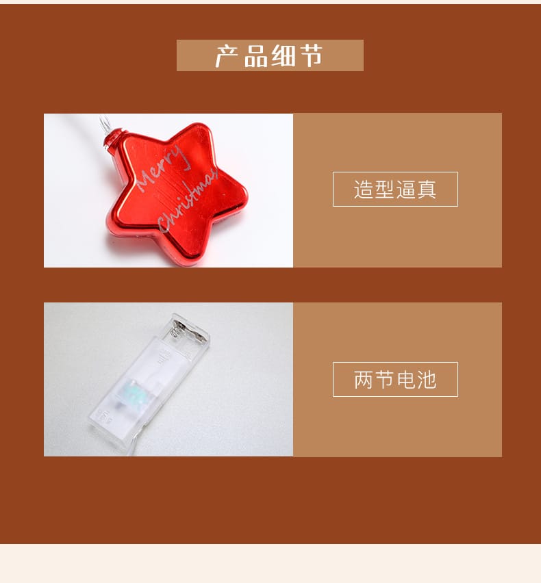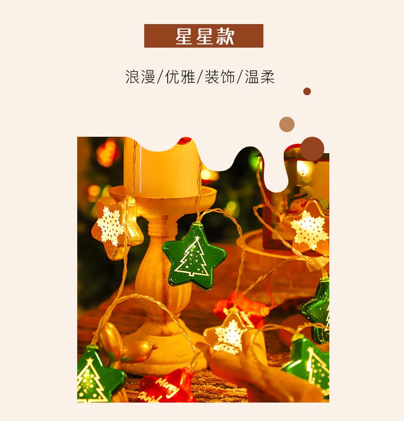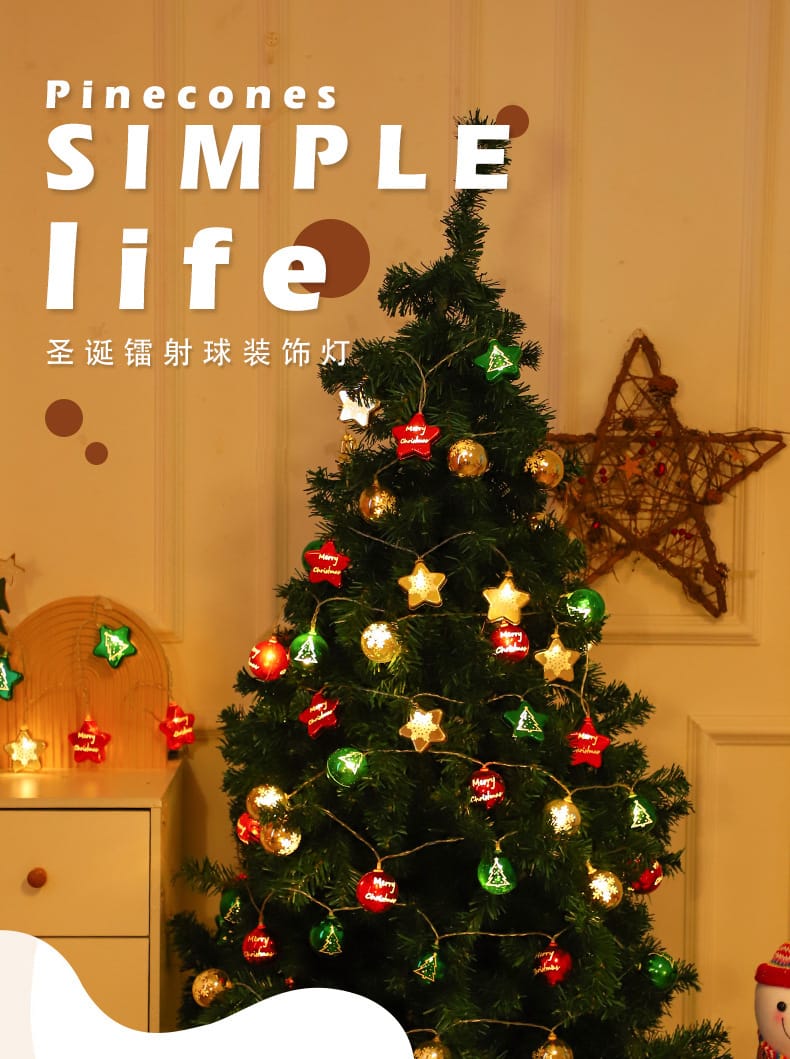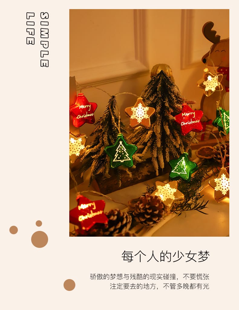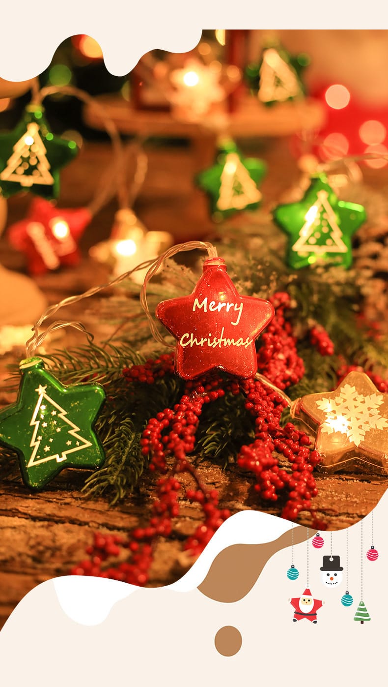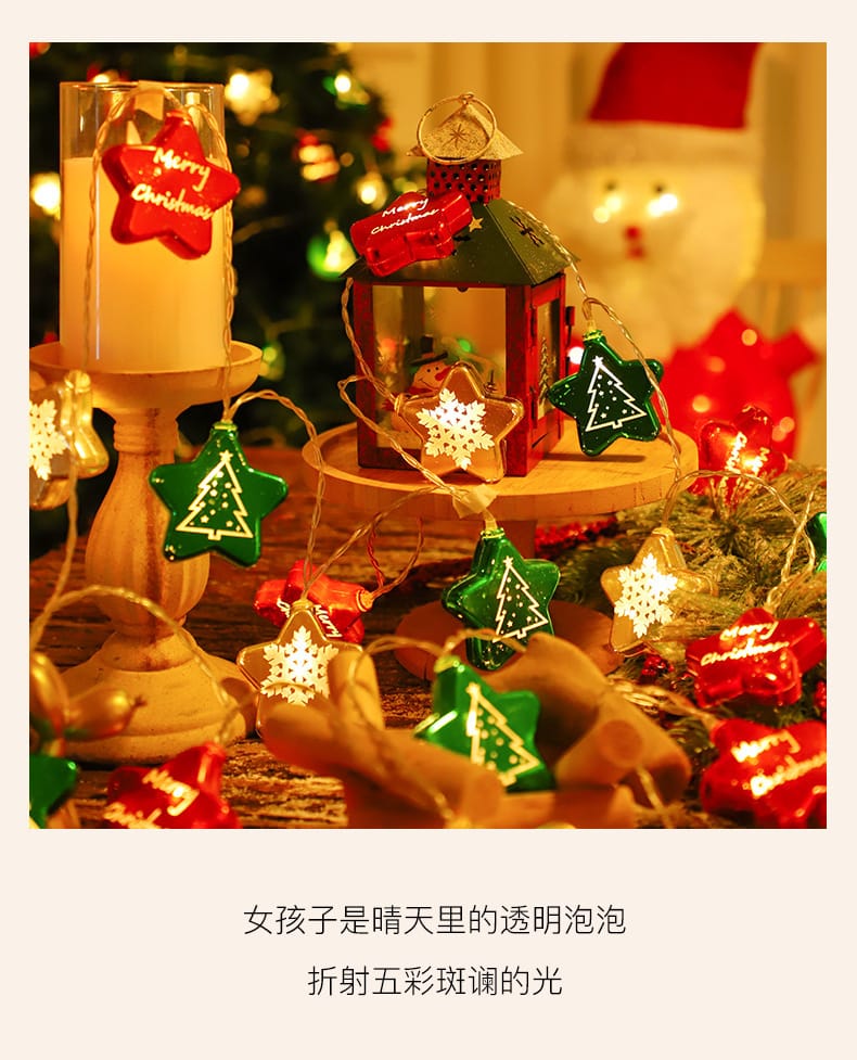 Sus estrellas decorativas de colores navideños (rojo, verde y dorado) cuentan con elegantes grabados de copos de nieve, árboles y la frase “Merry Christmas”, iluminados con una luz cálida que crea una atmósfera acogedora y festiva.